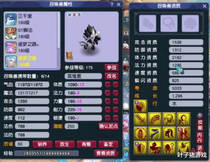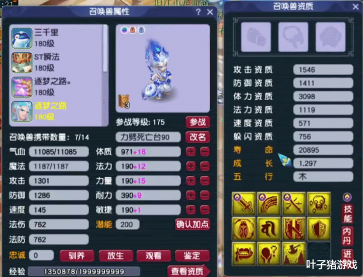第一只是13技能净台魔童,带两本蓝书。风少用高级金蝉顶掉小夜战。由于套装计划携带高神,若不继续改书,这只宝宝只能在白天召唤出场。